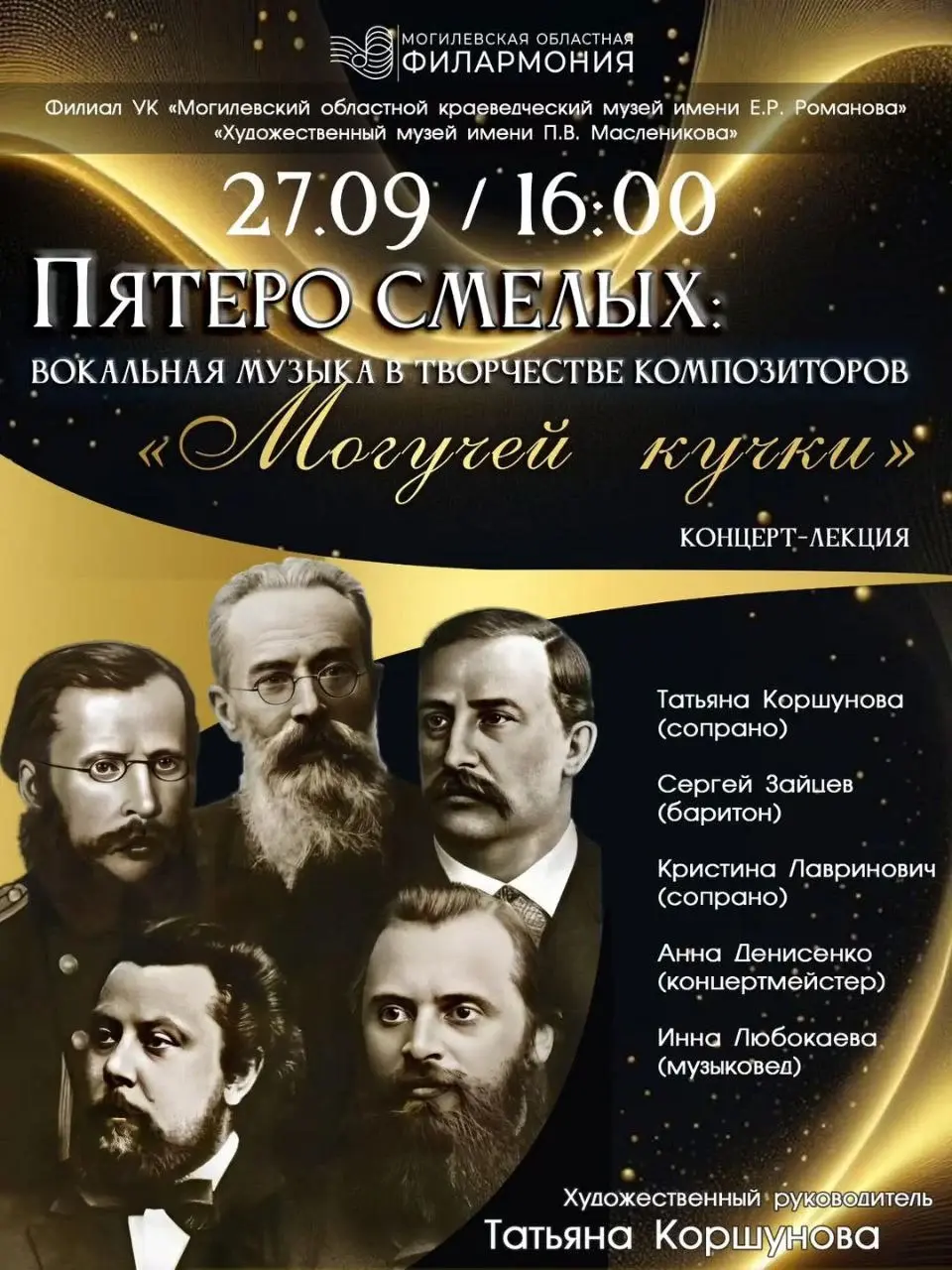 Концерт состоится 27 сентября в музее имени Павла Масленикова Могилева. Его исполнят Татьяна Коршунова (сопрано), Сергей Зайцев (баритон), Кристина Лавринович (сопрано), Анна Денисенко (концертмейстер), а также музыковед Инна Любокаева.