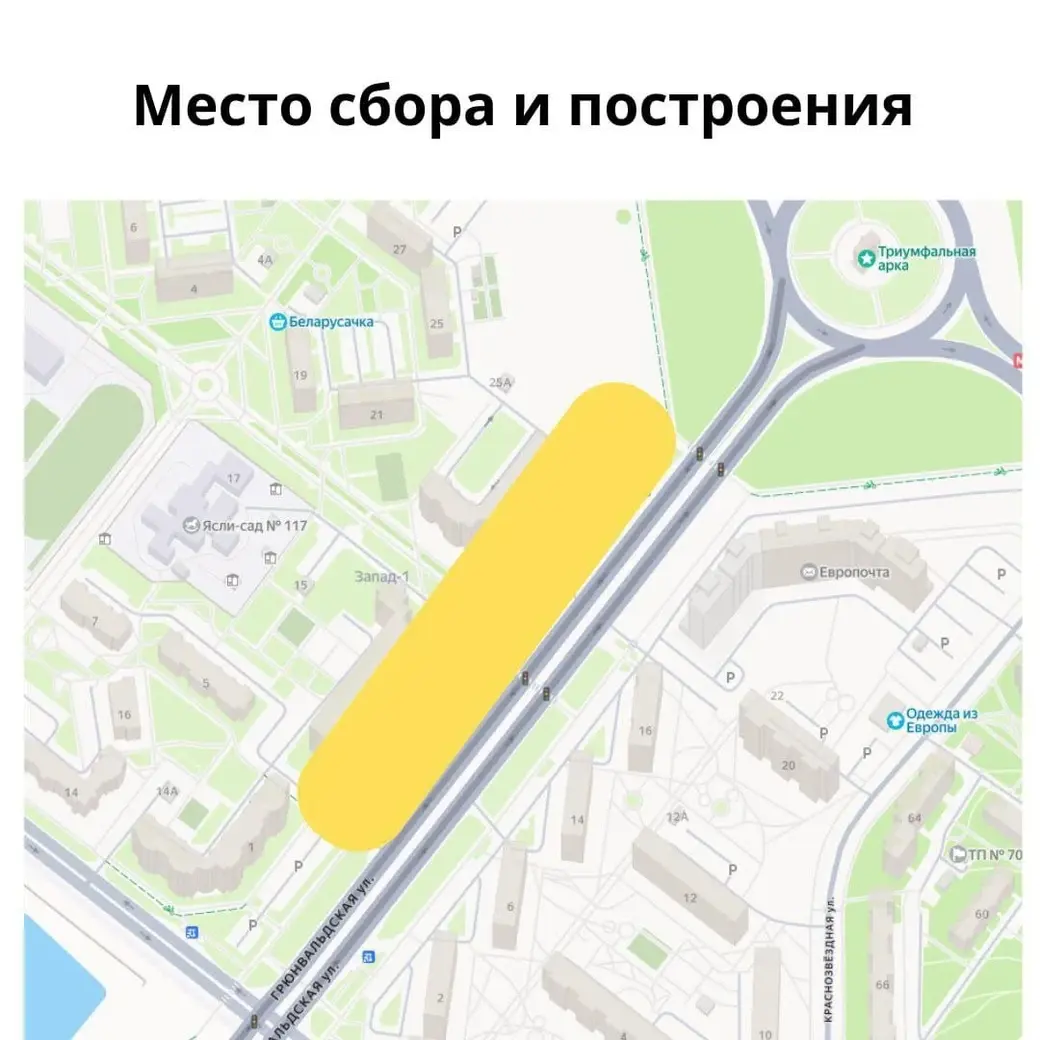 Для участия надо прибыть на место сбора участников по правой стороне ул. Грюнвальдской от ул. Тишки Гартного до ул. Минское шоссе с 09:00 до 09:40.