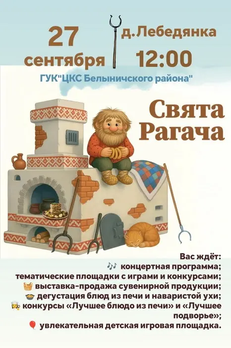Фестиваль «Свята Рагача» состоится 27 сентября в деревне Лебедянка Белыничского района Могилевской области. Начало в 12.00.