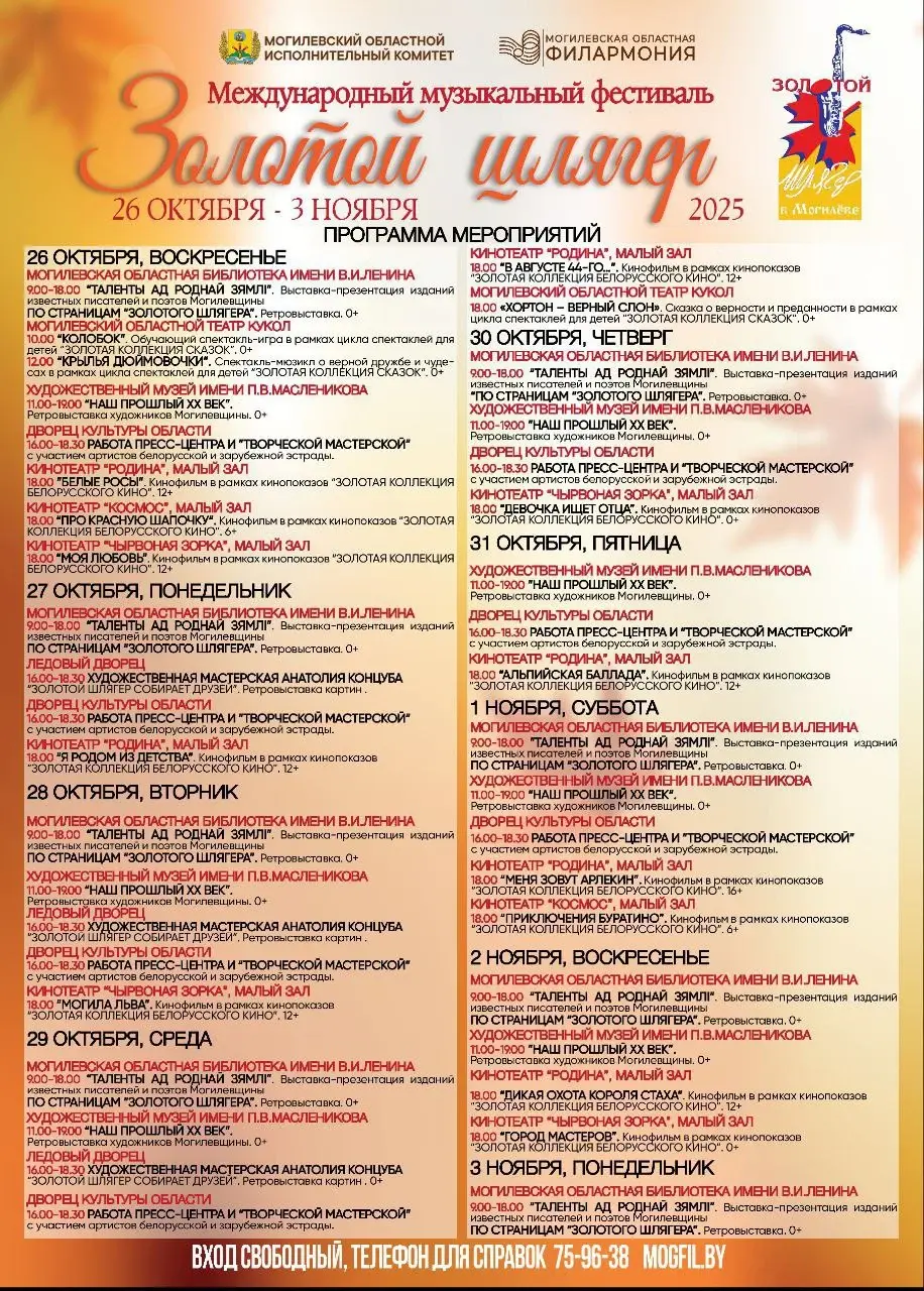 Стартует он 26 октября выставкой «По страницам «Золотого шлягера», которая откроется в Областной библиотеке имени Ленина. Главным событием фестиваля станет гала-концерт открытия (Ледовый дворец, 28 октября) с участием артистов из Беларуси, России, Грузии и Италии. Выступят: народный артист Беларуси Анатолий Ярмоленко и ансамбль «Сябры», народный артист Беларуси Василий Раинчик, Белорусский государственный ансамбль «Песняры», Арт-группа «Беларусы», заслуженные артисты Беларуси Виктория Алешко, Жанет, Ирина Дорофеева, Валерий Шмат, группа «Верасы», Александра Гайдук, народная артистка России Татьяна Овсиенко, заслуженные артисты Российской Федерации Алексей Глызин, Марина Хлебникова, группа Стаса Намина «Цветы», группы «Лесоповал», «Динамит», балет Ольги Шамровой, лаборатория танца Белорусского государственного университета культуры и искусств, шоу-балет «Сенсация», Театр-студия «РАДУГА» и другие. Ведущие мероприятия - народный артист России Дмитрий Харатьян, телеведущая Марианна Муренкова, представительница Беларуси на музыкальном конкурсе «Интервидение – 2025» Настя Кравченко.