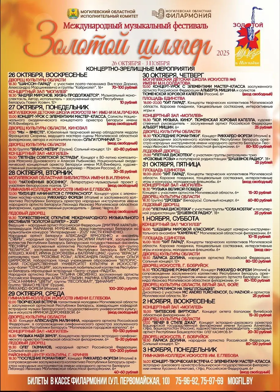 В Могилеве 26 октября стартует Международный музыкальный фестиваль «Золотой шлягер». В программе – выступления артистов из Беларуси, России, Грузии и Италии. Продлится фестиваль по 3 ноября.