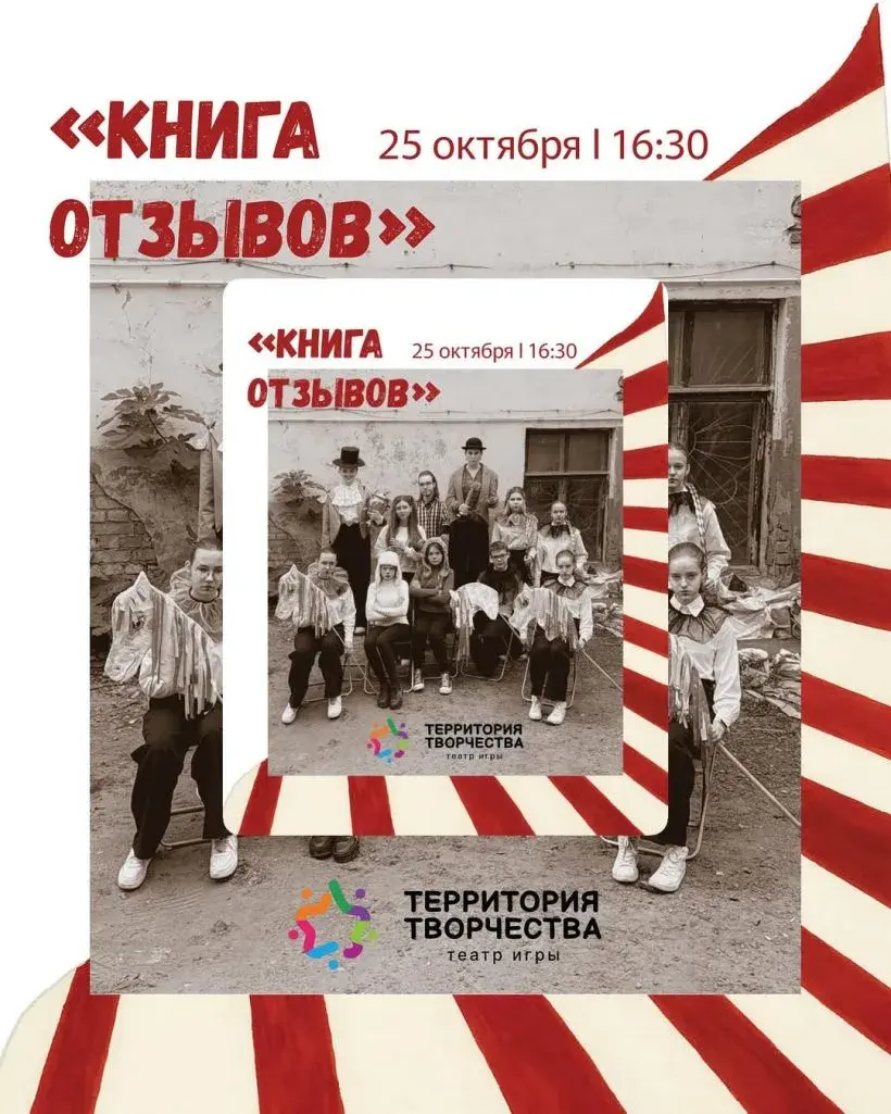 Спектакль «Книга отзывов» (12+) (спектакль-читка по мотивам пьесы Семена Вяткина) покажут воспитанники детской театральной студии «Территория творчества». Это история про мальчика Антона, который, прогуливая уроки, попал на цирковое представление и стал свидетелем ужасно интересных аттракционов с животными. В конце представления он оставил свой отзыв в книге с пожеланием добавить обезьянок в цирк. Его пожелание сбылось, вот только обезьянкой стал он сам…