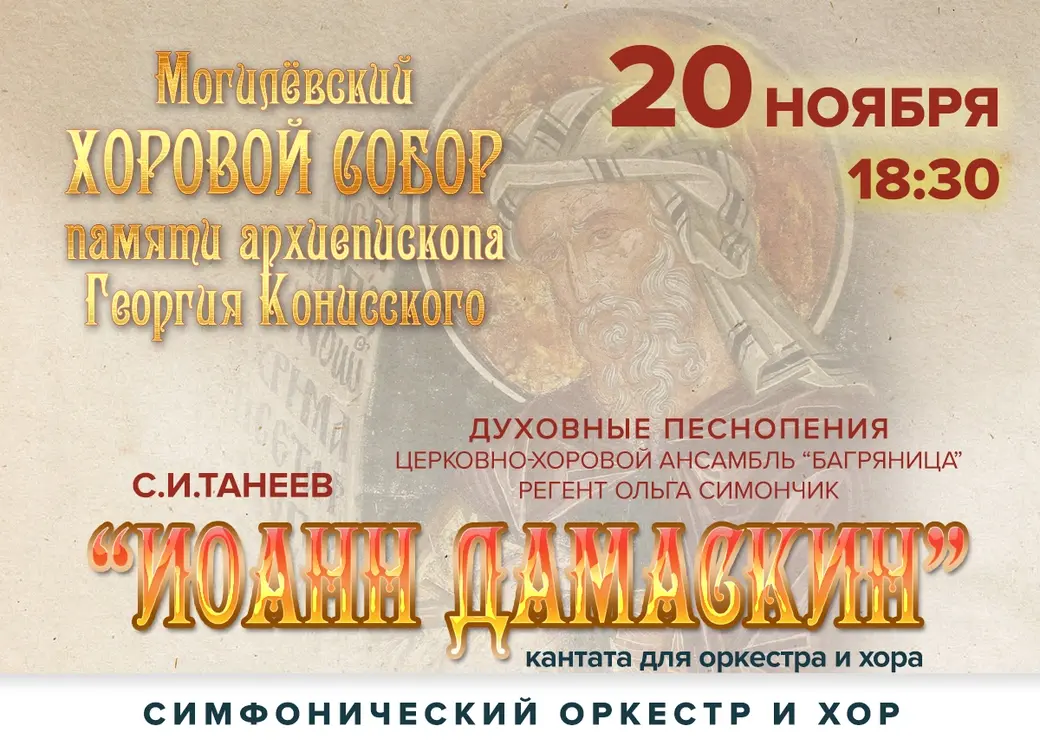 «Могилевский хоровой собор» – ежегодный музыкальный праздник хорового песнопения. Программа нынешнего сезона будет состоять из кантаты для оркестра и хора «Иоанн Дамаскин» Сергея Танеева. Ее исполнит хор Могилевской городской капеллы под руководством Сергея Лищенко.