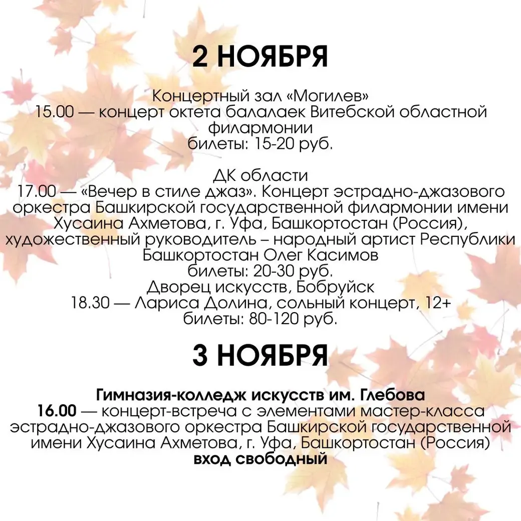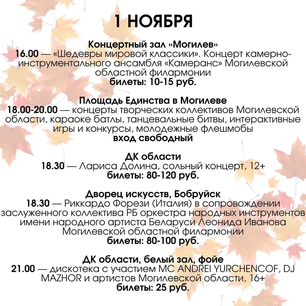 Первые дни ноября – это еще и завершающие дни фестиваля «Золотой шлягер». В программе – выступления артистов из Беларуси, России, Грузии и Италии. В субботу в афише фестиваля концерты могилевских и российских артистов, в том числе ансамбля «Камеранс» и Ларисы Долиной. Два концерта – балалаечников Витебской филармонии и эстрадно-джазового оркестра города Уфы – запланированы на воскресенье.