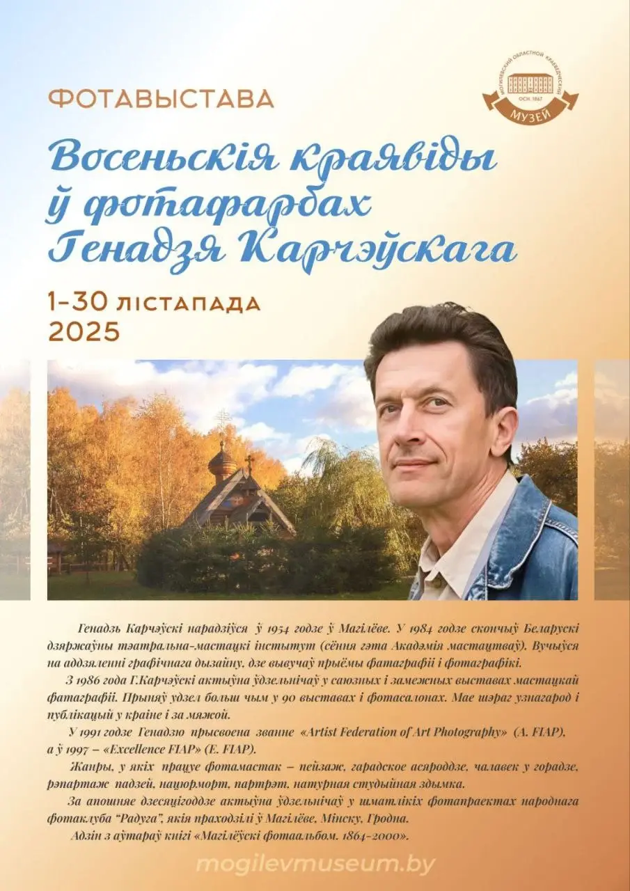 Свою очередную персональную выставку «Восеньскія краявіды» Геннадий Карчевский представляет в Могилевском краеведческом музее. Она будет работать с 1 по 30 ноября.