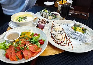 - Омлет «Амальфи» (яйца, снежный краб, крем чиз, икра стольная красная и черная, соус сладкий чили)