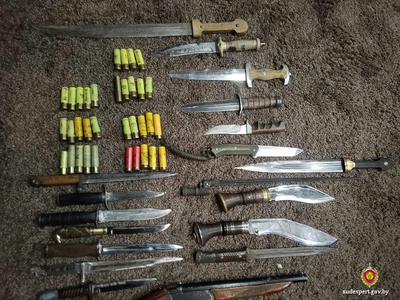 Почти два десятка ножей и штыков, патроны и обрез ружья изъяли дома у 51-летнего жителя Могилевского района сотрудники 11-го управления (по Могилевской области) ГУБОПиК МВД. Предметы направлены в управление Государственного комитета судебных экспертиз по Могилевской области для проведения экспертиз и решения вопросов о виде оружия, способе изготовления и иных.