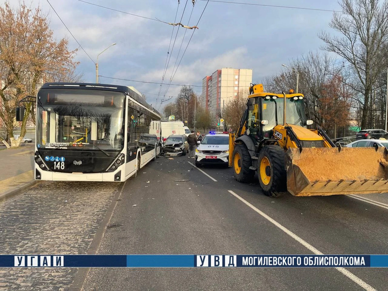 В Могилеве на улице Первомайской 54-летний водитель экскаватора-погрузчика JSB, чтобы объехать троллейбус, остановившийся на остановочном пункте, выехал на крайнюю левую полосу движения, где произошло столкновение с автомобилем Volvo, который от удара отбросило, и он врезался в троллейбус.