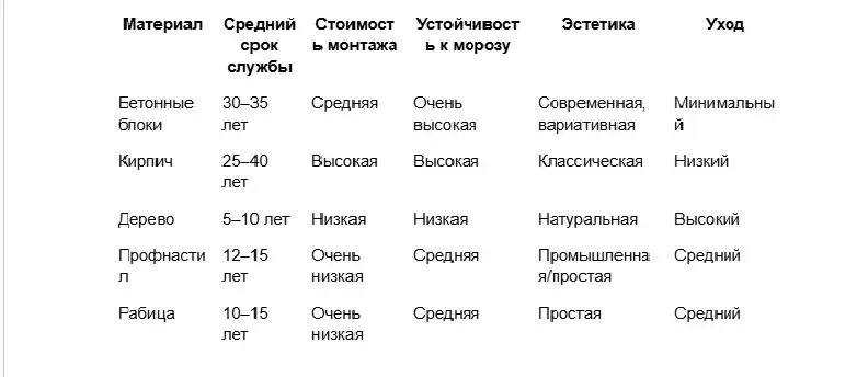 Сравнительная таблица материалов для забора