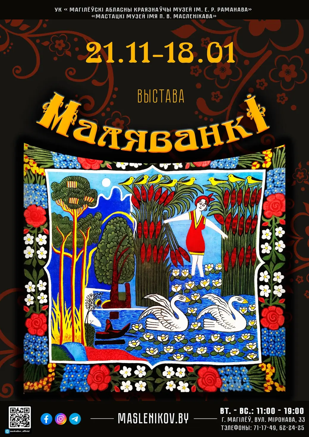Выставка «Маляванкi» представлена в художественном музее имени Павла Масленикова Могилева. Будет работать с 21 ноября по 18 января 2026 года. Справка по телефонам: 80222-71-17-49; 62-24-25.