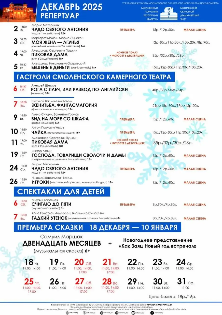 Ниже подробная афиша декабря. На протяжении месяца в ней возможны изменения. Справка по телефону: 80222-65-52-34.