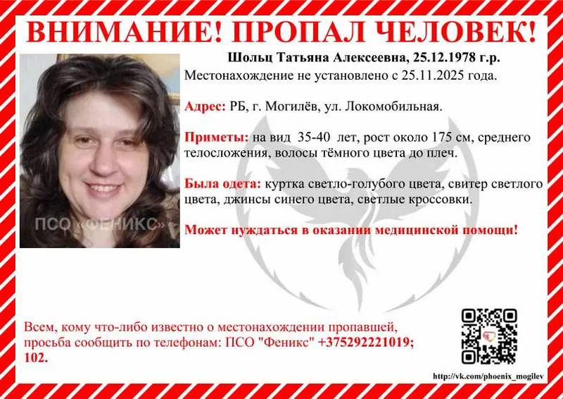Пропала могилевчанка Татьяна Алексеевна Шольц, 978 года рождения, сообщили в ПСО «Феникс».