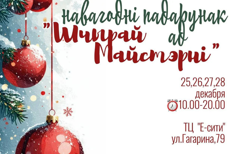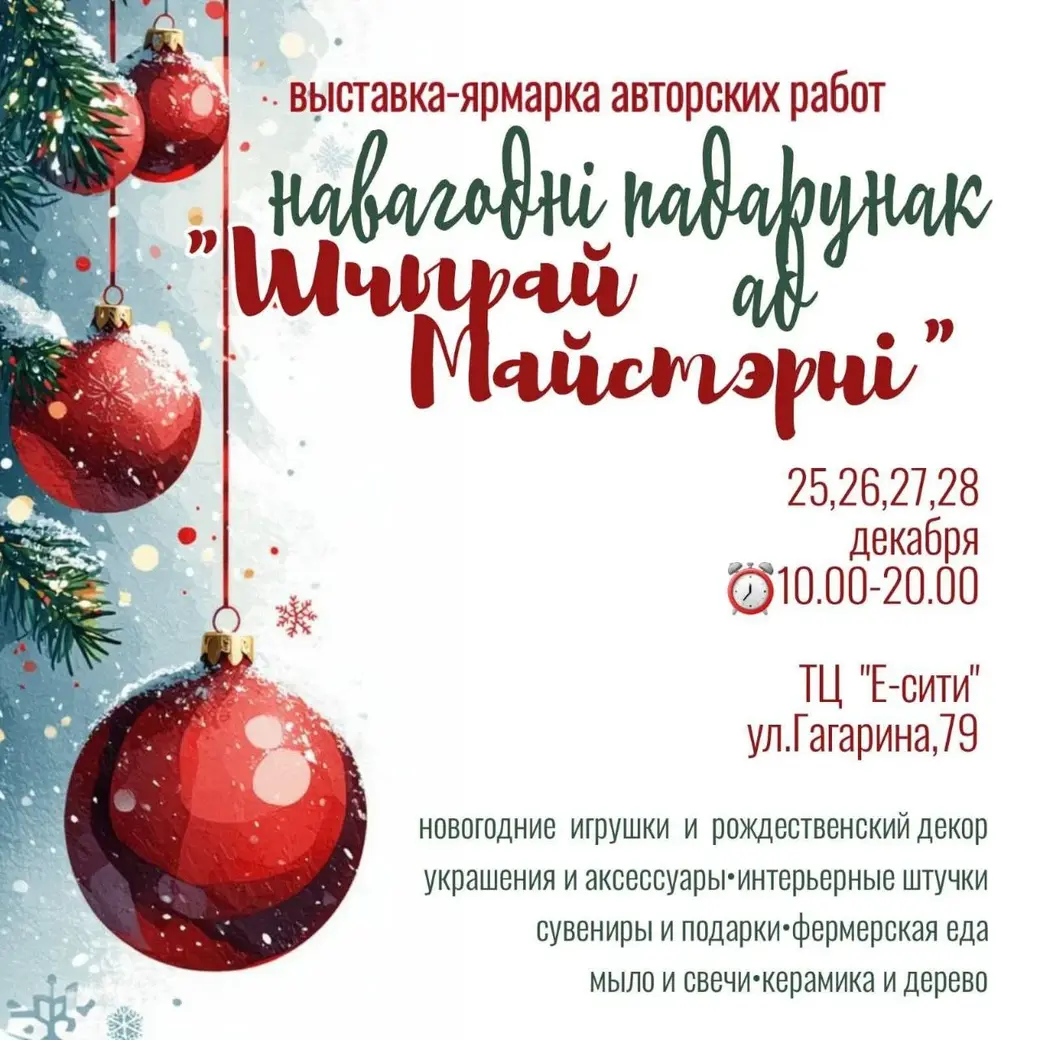 Выставка-ярмарка «Навагодні падарунак ад «Шчырай Майстэрні» будет работать 25, 26, 27 и 28 декабря с 10.00 до 20.00 в торговом центре «Е-Сити» (ул. Гагарина, 79).