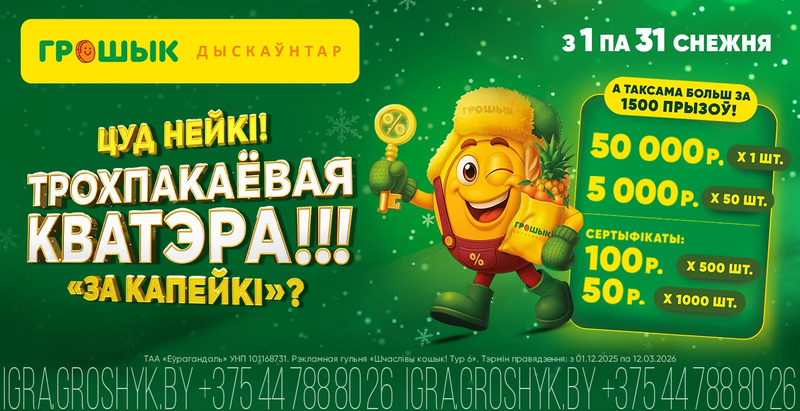 Срок проведения рекламной игры «Шчаслiвы кошык! Тур 6» с 01.12.2025 по 12.03.2026. Подробности — на сайте igra.groshyk.by или по телефону +375 44 788 80 26.