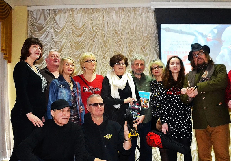На одной из наших тусовок в 2017 году во дворике Пожарного переулка Людмилу сфотографировали подле снимка-плаката, на котором Александр был запечатлен с друзьями в молодости.