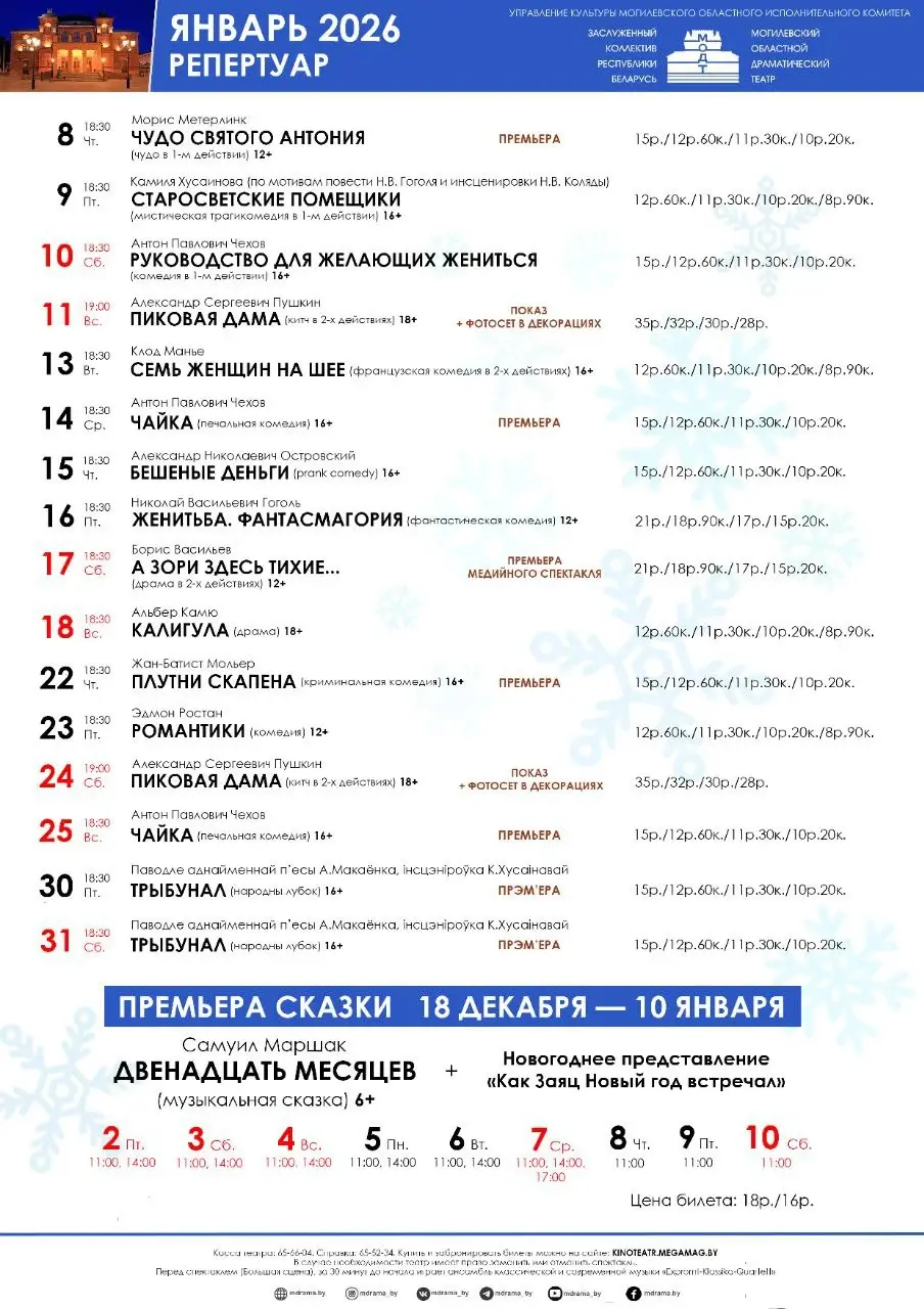 Январь в Могилевском драмтеатре начнется показом сказки «Двенадцать месяцев», точнее показ сказки продолжится по 10 января – спектакль специально подготовлен к встрече Нового 2026 года. Перед спектаклем детей ждет новогоднее представление у елки «Как Заяц Новый год встречал».