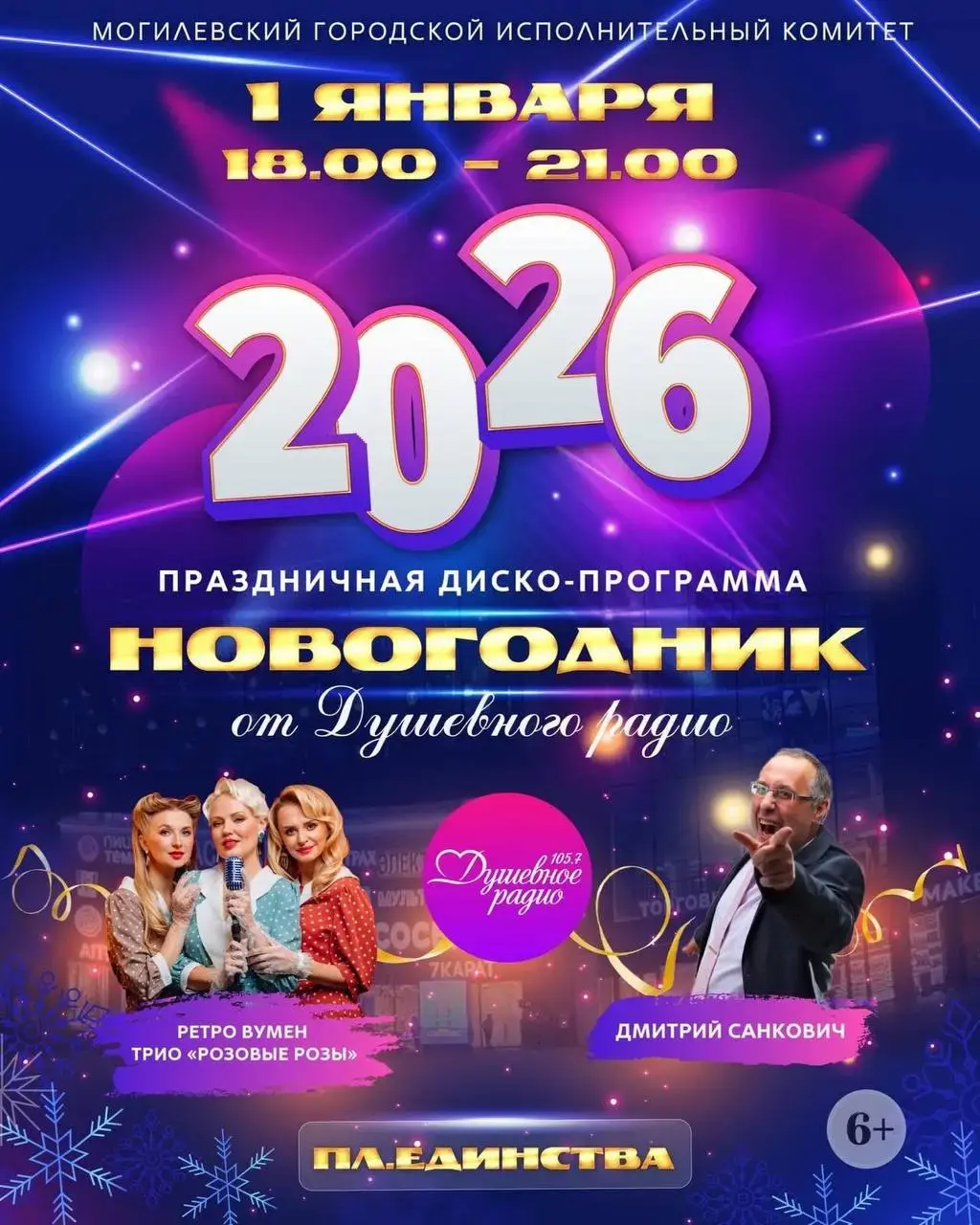 Уже днем в первый день нового года для желающих продолжить праздник пройдет танцевально-развлекательная программа с участием группы «Ретро Вумен Трио «Розовые Розы». Ведущий – Дмитрий Санкович.