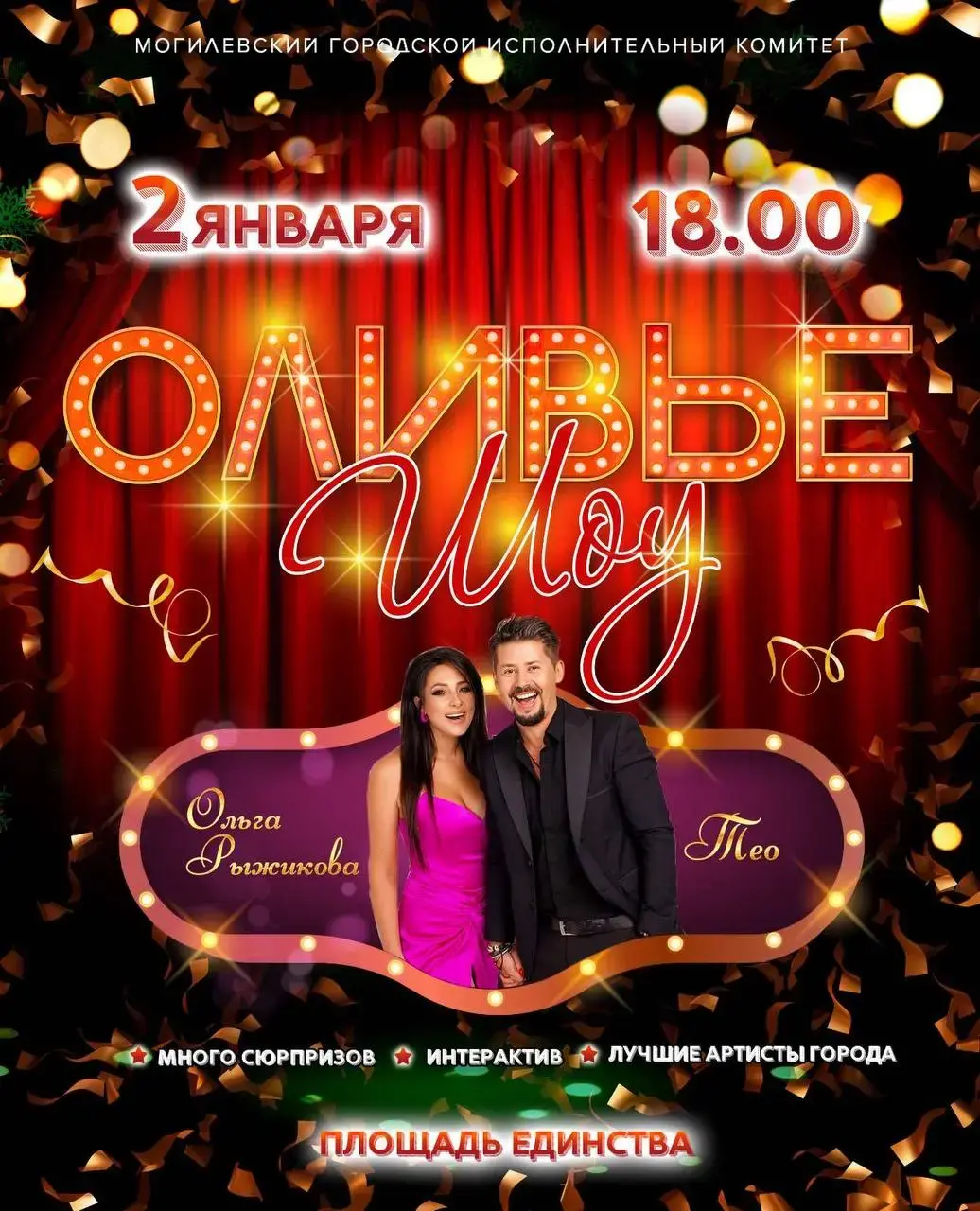 По случаю Нового года в Могилеве «оливье» не только на столе, а и возле главной городской елки, точнее там «оливье-шоу» с живым интерактивом, музыкальными номерами, розыгрышем подарков и самых разных сюрпризов. Ведущие – Ольга Рыжикова и Тео.