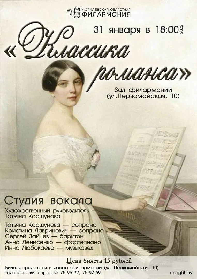 Концерт «Классика романса» состоится 31 января в зале Могилевской областной филармонии. Начало в 18.00. Цена билета – 15 руб. Дополнительную информацию можно получить по телефонам: 80222-75-97-69, 75-96-92.