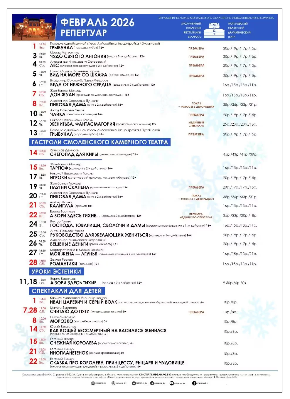 Ниже подробная афиша февраля. На протяжении месяца в ней возможны изменения. Справка по телефону: 80222-65-52-34.