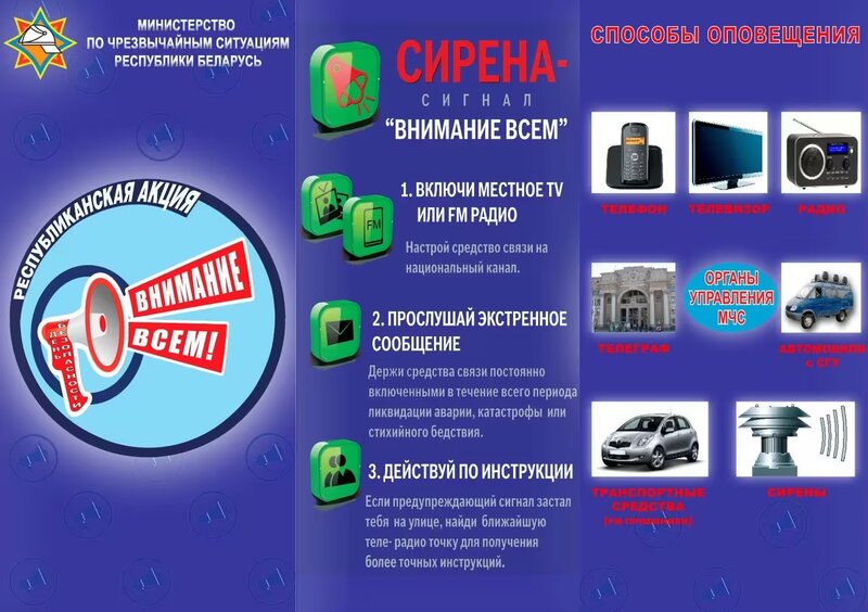 - Жители, услышав сигнал «Внимание всем!» (звук сирены на улице), должны как можно скорее включить теле- или радиоприемник, подключиться к сети Интернет для посещения информационных порталов (в первую очередь сайта МЧС: www.112.by) и следовать передаваемым инструкциям.