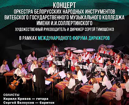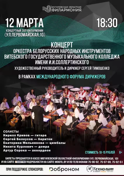 В первый его день, то есть 12 марта, состоится концерт обладателя Гран-при конкурса имени Л.Л. Иванова 2024 года – оркестра белорусских народных инструментов Витебского государственного музыкального колледжа имени И.И.Соллертинского (художественный руководитель и дирижер Сергей Тимошенко). Начало в 18.30. Концерт состоится в зале Могилевской филармонии.