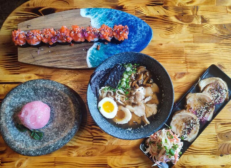 За основу был взят грибной суп с шампиньонами на бульоне, сваренном на белых грибах. Наш родной супчик шеф-повар удачно совместил с азиатской кухней. Вкус получился маслянистый и глубокий, с небольшой фирменной кислинкой. Упругая лапша, яйцо, зелень, грибы и мясо – кажется, на таком сытном рамене можно было бы и завершить обед.