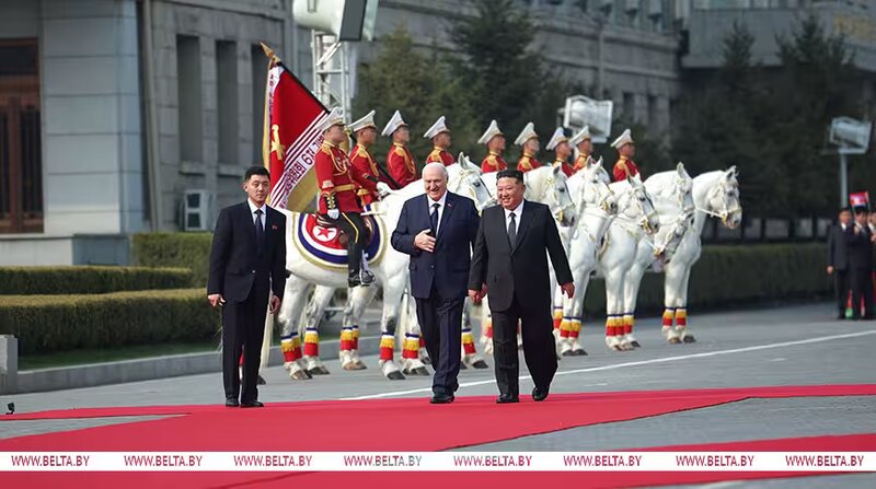 Церемония официальной встречи Президента Беларуси Александра Лукашенко Председателем Государственных дел Корейской Народно-Демократической Республики Ким Чен Ыном прошла в Пхеньяне, передает БЕЛТА.