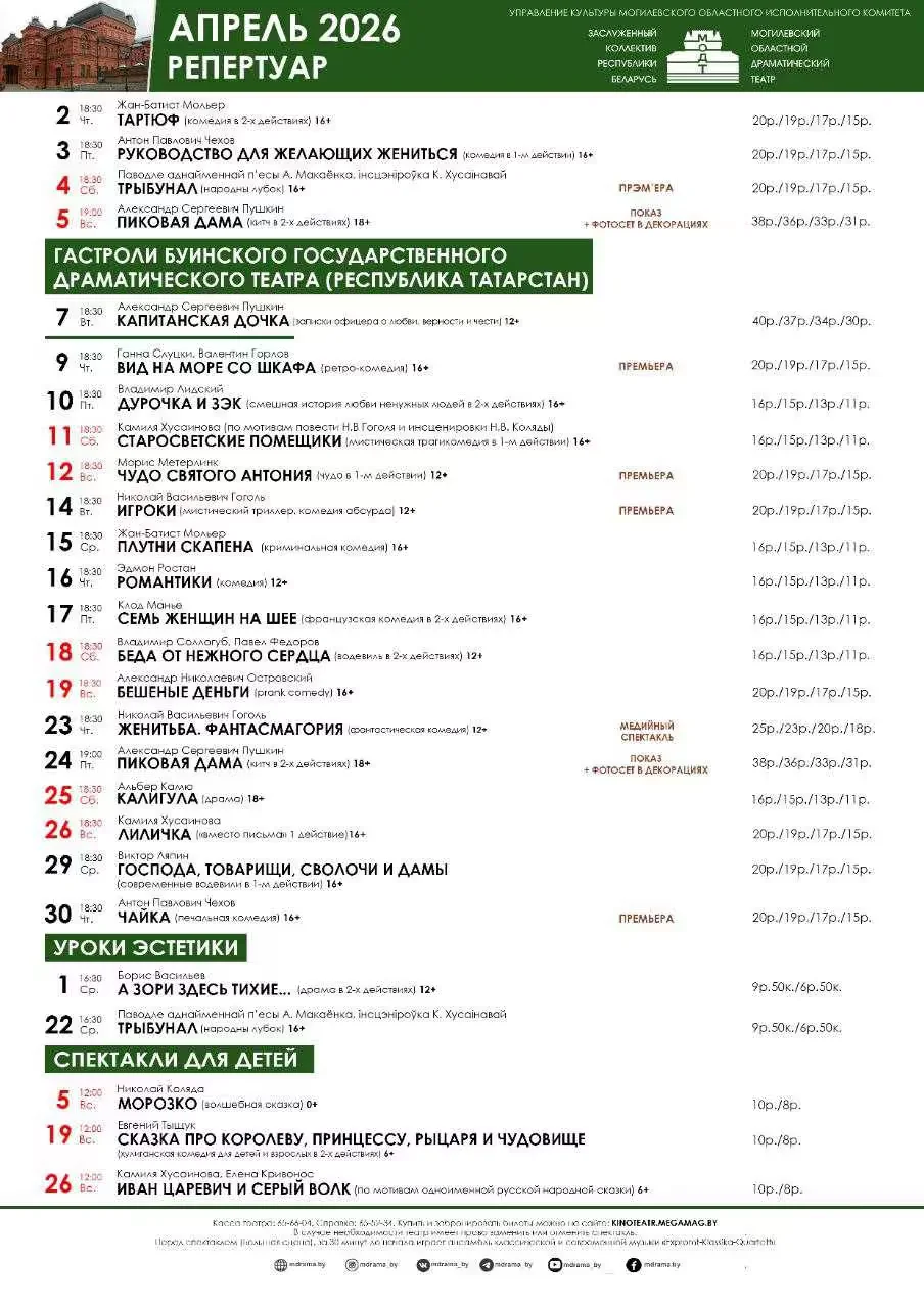 В афише апреля Могилевского драмтеатра 26 постановок для детей и взрослых, в том числе самые яркие премьеры текущего сезона, а также спектакли, пользующиеся повышенным интересом у зрителя на протяжении многих лет. Традиционно по воскресеньям спектакли для юного зрителя.