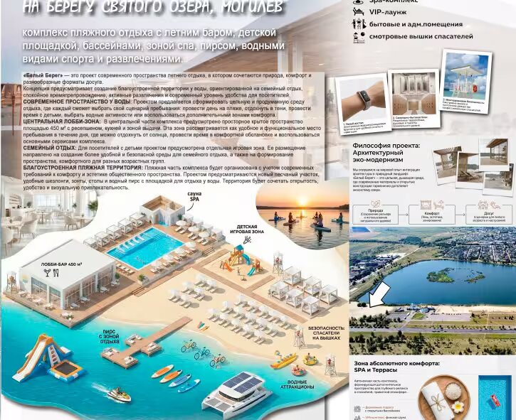 Концепция комплекса предусматривает создание благоустроенной территории у воды, ориентированной на семейный отдых. В рамках проекта создадут благоустроенную пляжную часть комплекса с учетом современных требований к комфорту и эстетике: новый песчаный участок, удобные шезлонги, зонты, столы и водный пирс с площадкой для отдыха у воды.