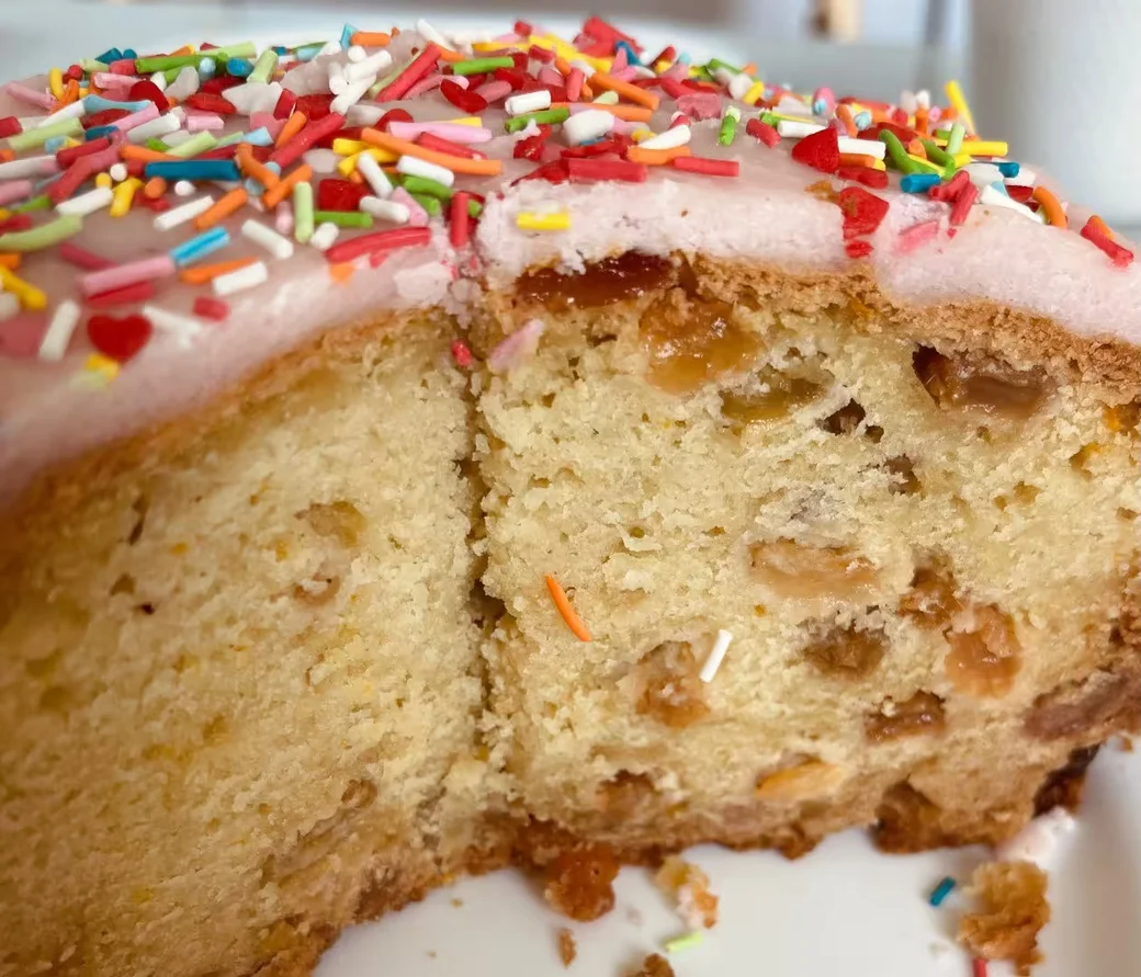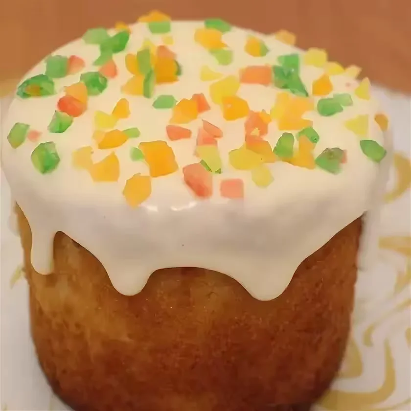 14. Готовые куличи достаем из духовки, даем остыть до теплого состояния. Покрываем поверхность белковой глазурью и посыпаем кондитерской посыпкой.