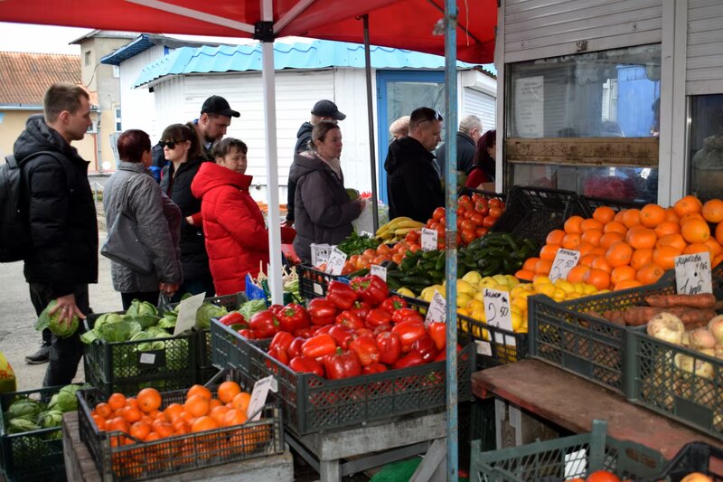 На «Западном» еще не многолюдно, но всё основное есть. Товар покрупнее, типа бульбы-огурцов, с оптовых баз, помельче, типа зелени – со своих огородов. Для большинства продуктов для сравнения укажем и цены с Центрального рынка три недели назад.