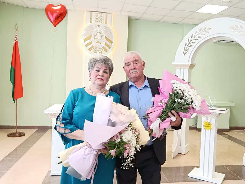 Именно так – всей семьей, с близкими и друзьями – супруги торжественно отметили золотую свадьбу в зале Глусского ЗАГСа. Звучал свадебный марш Мендельсона, был традиционный свадебный рушник, вальс и поцелуй. Но самым трогательным моментом стал обмен кольцами: их золотым юбилярам вручил самый маленький член семьи – четырехлетний внук Богдан.