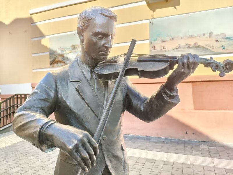 Скульптуру Скрипача установили недалеко от фонарей-музыкантов и ансамбля ударных инструментов, в которые сыграть может любой желающий, гуляющий по Ленинской.